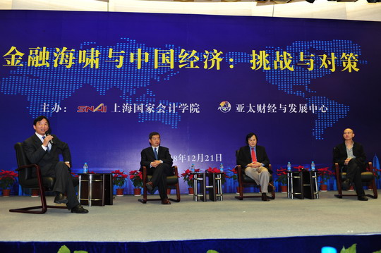 12月21日冬至,上海极速降温,上海国家会计学院的国际会议中心内却是一派热闹气氛,台上的嘉宾兴致盎然,侃侃而谈,台下的听众济济一堂,专心致志。这里正在举行一场以“金融海啸与中国经济:挑战与对策”为主题的校友论坛。AFDC主任夏大慰教授主持论坛,近400位上海国家会计学院校友参与了此次论坛。