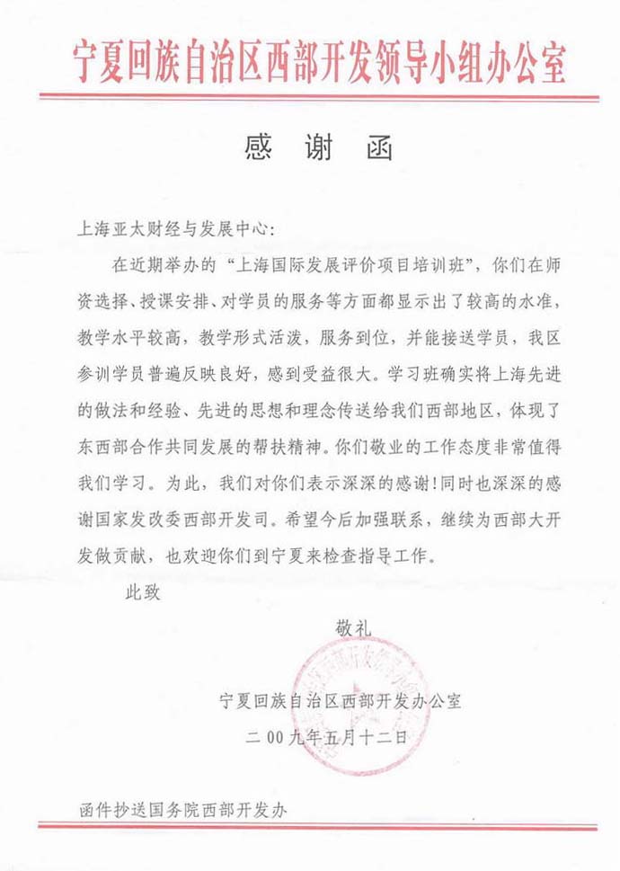 近日,宁夏回族自治区西部开发办公室向亚太财经发展中心发来了感谢信,就我中心通过“上海国际发展评价培训项目”向西部传送“先进的做法和经验、先进的思想和理念”表示感谢,并认为这种做法“体现了东西部合作共同发展的帮扶精神”。