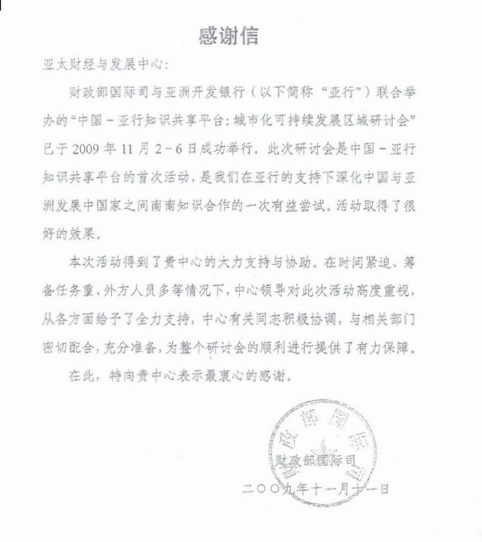 财政部国际司与亚洲开发银行联合举办的“中国-亚行知识共享平台:城市化可持续发展区域研讨会”已于2009年11月2-6日成功举办,财政部国际司于11月11日发来感谢信: