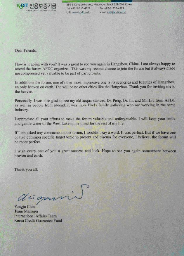 韩国信用担保基金致AFDC感谢信