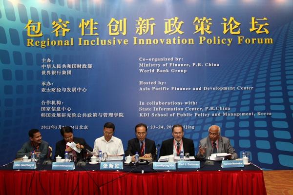 由中国财政部、世界银行集团联合主办,财政部亚太财经与发展中心承办的“包容性创新政策”论坛于2012年5月23-24日在北京举行。近百名来自APEC各经济体财政部和中央银行等政府部门的官员、世界银行和亚洲开发银行等国际机构的代表、以及企业界的代表参加了本次论坛。论坛开幕式由亚太财经与发展中心副主任李扣庆主持。财政部国际司副司长王忠晶和世界银行金融与私营部门发展局业务经理 Stefano Negri先生分别代表财政部和世界银行做了开幕主旨发言。