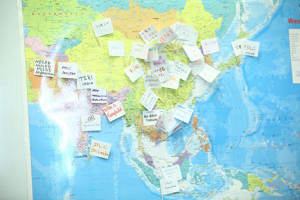 在自我介绍环节,每位与会代表的桌上摆放着两样东西:一张张内容各异、色彩斑斓的图片,一只只小小的内容空白的旗帜。“你可以充分发挥你的想象力,向他人解读你手中图片与你的内在关联;你可以用用任何形式的语言符号,在这个旗帜上标注你的出处,插到地图上你的机构所处的位置!”