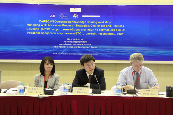 2012年7月24日,由亚太财经与发展中心(AFDC)、亚洲开发银行(ADB)和亚洲研究院(ADBI)联合举办的中亚区域经济合作组织(CAREC)“入世”知识分享项目:管理“入世”进程——战略、挑战和实践国际培训在上海国家会计学院开班。AFDC李扣庆副主任、ADB中亚局区域合作和业务协调处处长Vicky C. L. Tan女士参加开幕式并致辞,ADBI高级能力建设专家David Kruger先生主持开幕式。