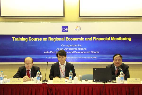 2012年9月3日,由亚太财经与发展中心(AFDC)和亚洲开发银行(ADB)共同组织的“区域经济与金融监管”(REFM)国际培训班在上海国家会计学院开班。中心彭润中处长、ADB区域经济一体化局高级经济学家Hoe Yun Jeong先生和Joshua Greene教授参加开幕式并分别致辞。亚太财经与发展中心李扣庆主任出席了当天晚上举行的欢迎晚宴。