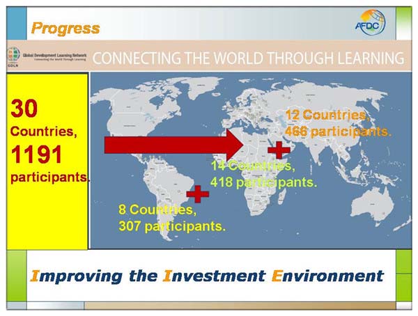 10月24日下午6点至8点,由亚太财经与发展中心与世界银行面向非洲区域定制设计的“改善投资环境”第三期远程系列国际研讨会在上海成功举办。来自上海、华盛顿、坦桑尼亚、肯尼亚、埃塞俄比亚、塞内加尔、喀麦隆、贝宁等8个国家的124名代表通过世界银行全球发展学习网络(GDLN)参加了该研讨会。