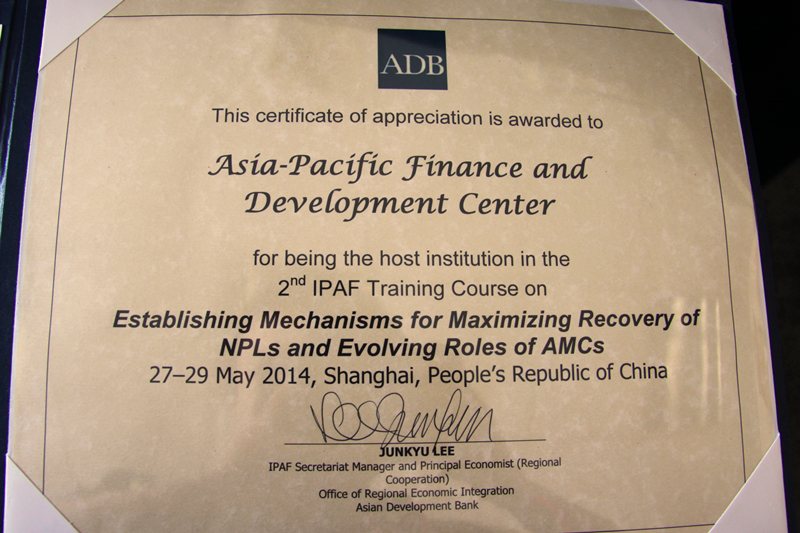 在为期三天的培训和研讨中,各国学员表通过主题演讲、案例研讨、小组交流等形式,围绕银行不良资产处置、资产管理公司的建立与运营以及区域及全球不良贷款管理与处置的最佳实践等主题进行了知识分享,并展开了热烈的讨论交流。培训结束后,ADB向AFDC赠送了荣誉证书,以对AFDC作为合作主办机构为此次培训的成功举办所做出的努力和贡献表示感谢。