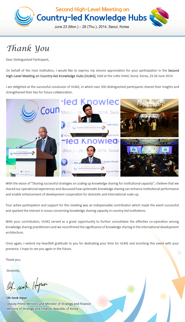 本着“分享各国机构能力建设成功战略”的共同使命,HLM2会议取得丰硕成果。会后,韩国副总理兼战略与财政部部长Oh-Seok Hyun 先生代表主办方发来感谢信,如下: