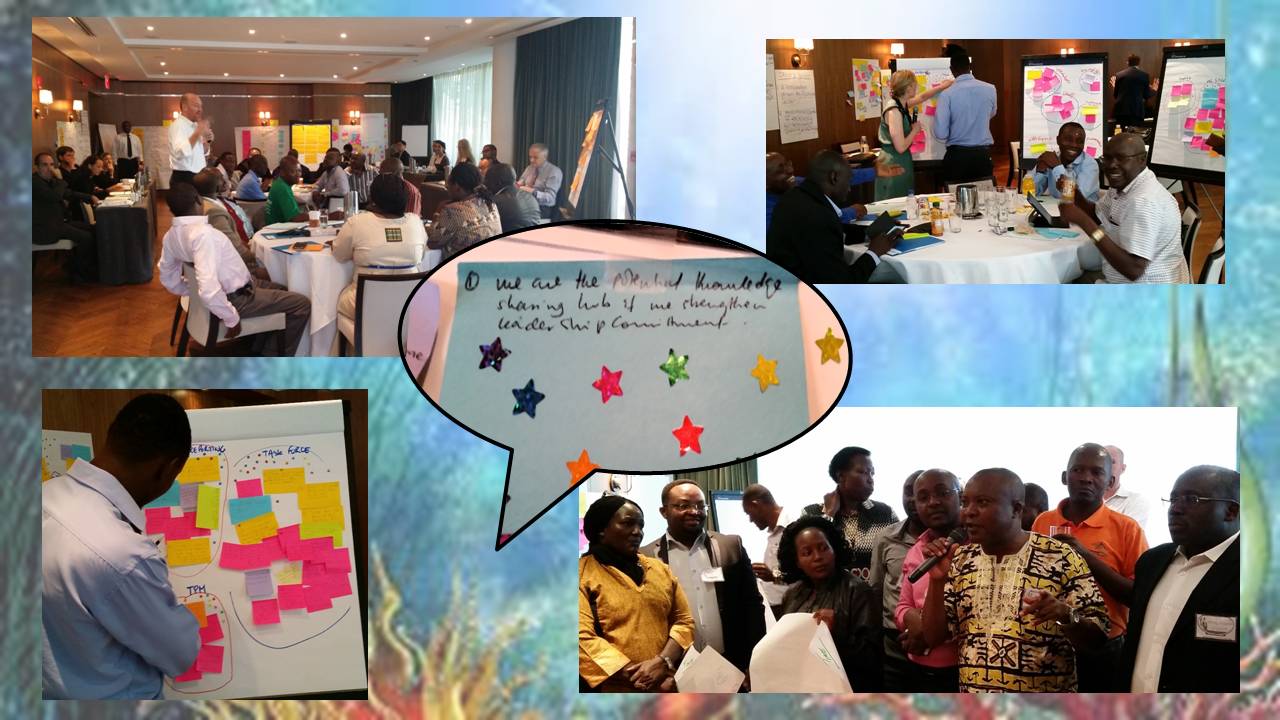 “鱼缸中”,乌干达代表在世行知识中心团队带领下,从对当前组织能力的自我评估开始,在精心设计的正反方辩论与审判团决议、角色扮演、故事讲述、投票排行、绘图想象等丰富多彩的策略引导与激发下,应用快速结果导向的方法和工具,开发知识分享的组织愿景、行动计划以及领导力与政策方案等。