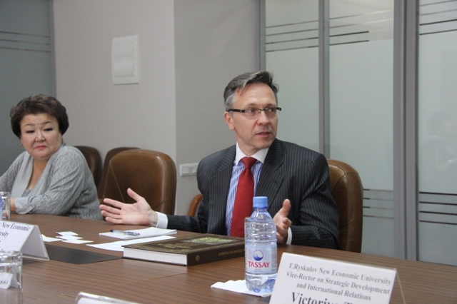 5月27日,代表团访问了阿拉木图Turar Ryskulov新经济大学。新经济大学校长Krysztof Rybinski教授,国际合作处处长Shynar Imangaliyeva等8人接待了代表团一行。Rybinski校长介绍了新经济大学的学科建设等情况,说明新经济大学的目标是在2018年成为中亚地区最好的商学院。目前新经济大学已经是哈萨克斯坦排名第一的商学院。未来,新经济大学将致力于成为国际知名商学院。应用型研究和国际化是该校的发展方向。