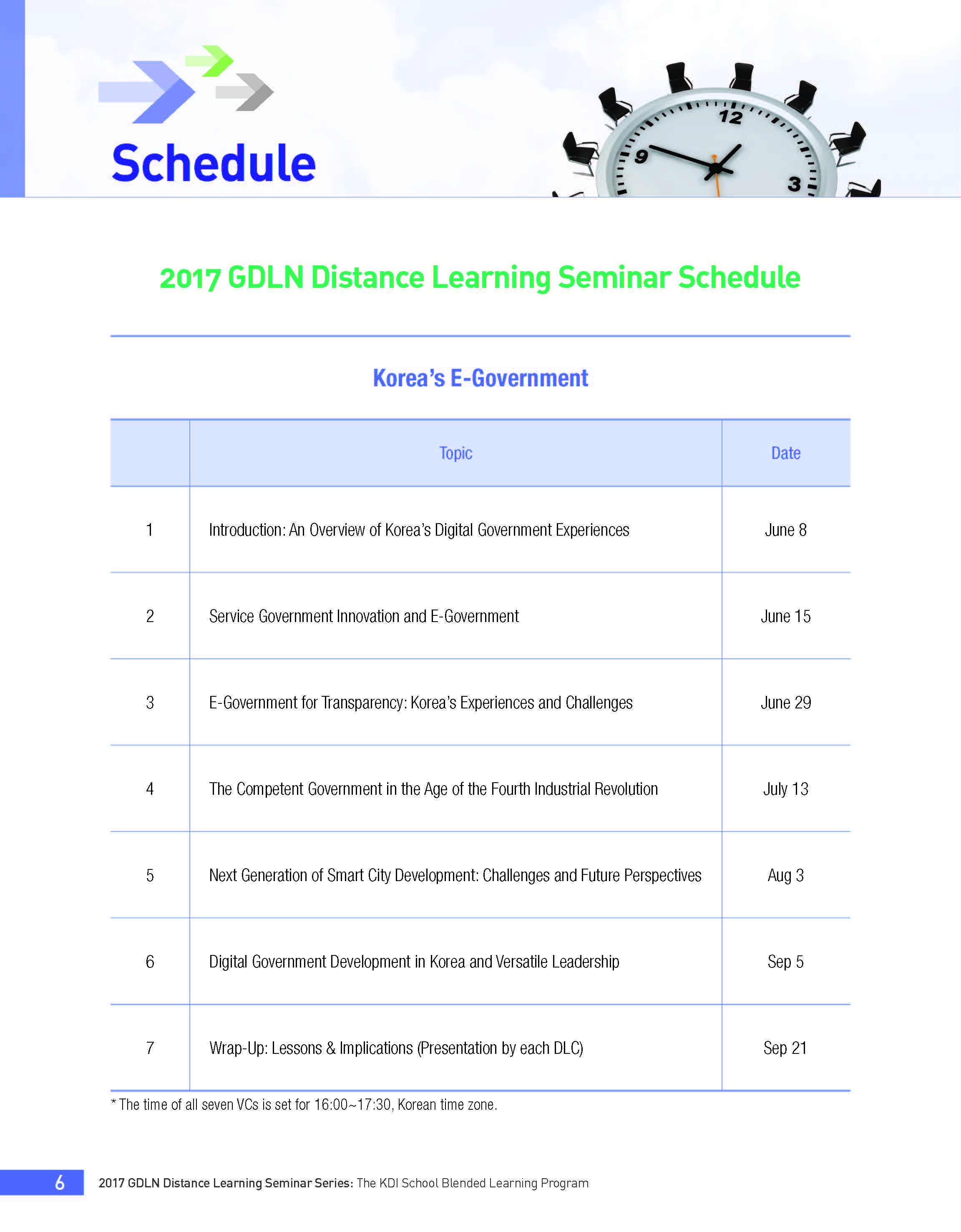 韩国发展研究院(KDI)是韩国顶尖的经济政策研究院,亚洲首屈一指的政府智库;作为其中的教育部门,公共政策与管理学院(KDI School)是韩国发展研究院中受韩国政府资助培养国际留学生的学院。2014年7月韩国发展研究院公共政策与管理学院成为世界银行领导下的全球发展学习网络(GDLN)的全球秘书处。KDI School的混合式培训旨在分享韩国经济发展模式,为GDLN区域成员学习韩国经验提供多维度的渠道。本年度KDI混合式培训从6月开始,到12月结束,包括7期远程国际研讨会和一期面授培训。