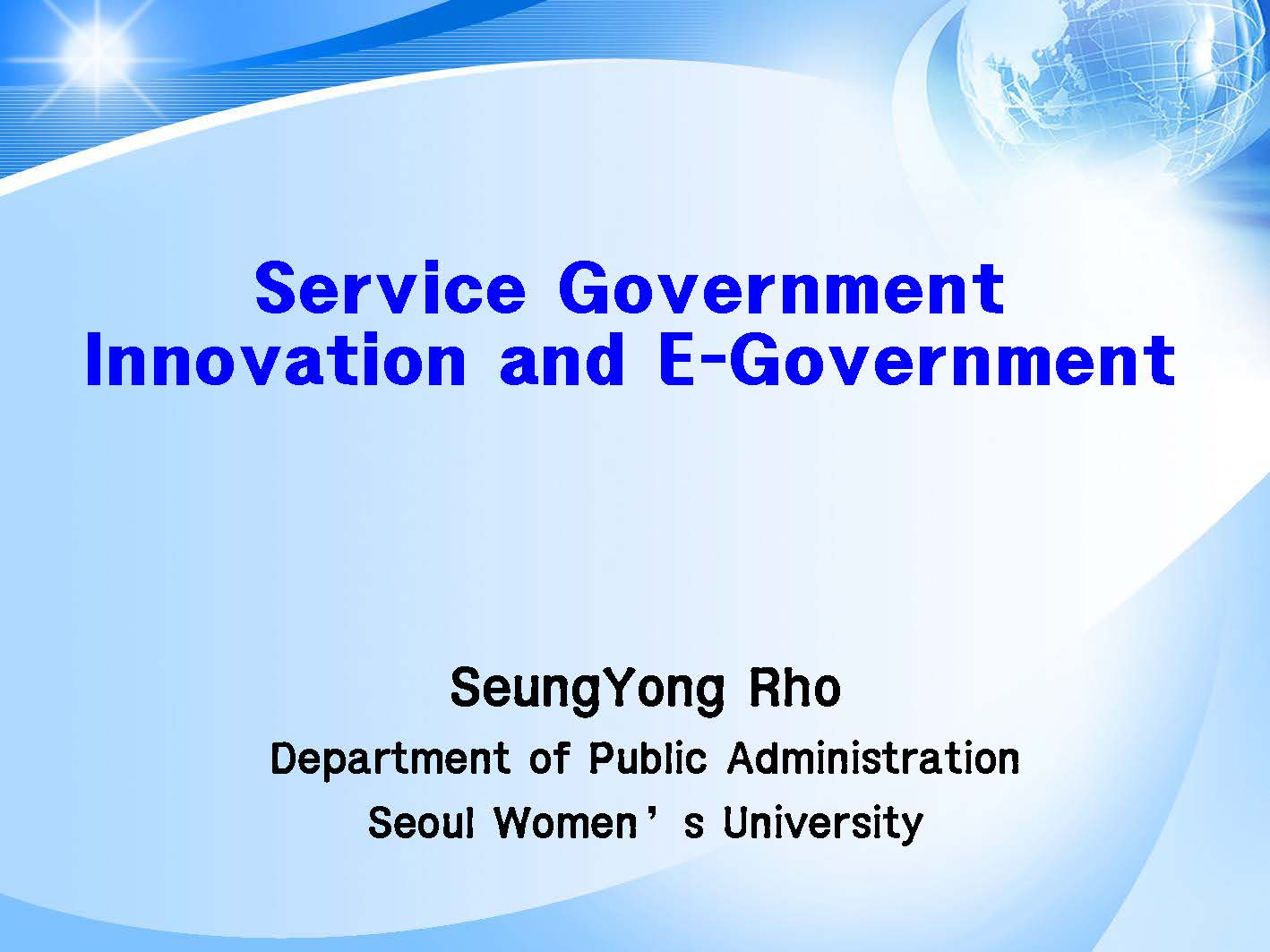 本期研讨会主题是“韩国服务型政府的创新”,来自首尔女子大学的SeungYong Rho教授介绍了为什么韩国政府需要创新,韩国电子政务发展的5个阶段、“开放、交流、合作、共享”4个原则等等,并具体介绍了韩国建设服务型政府的创新性举措。