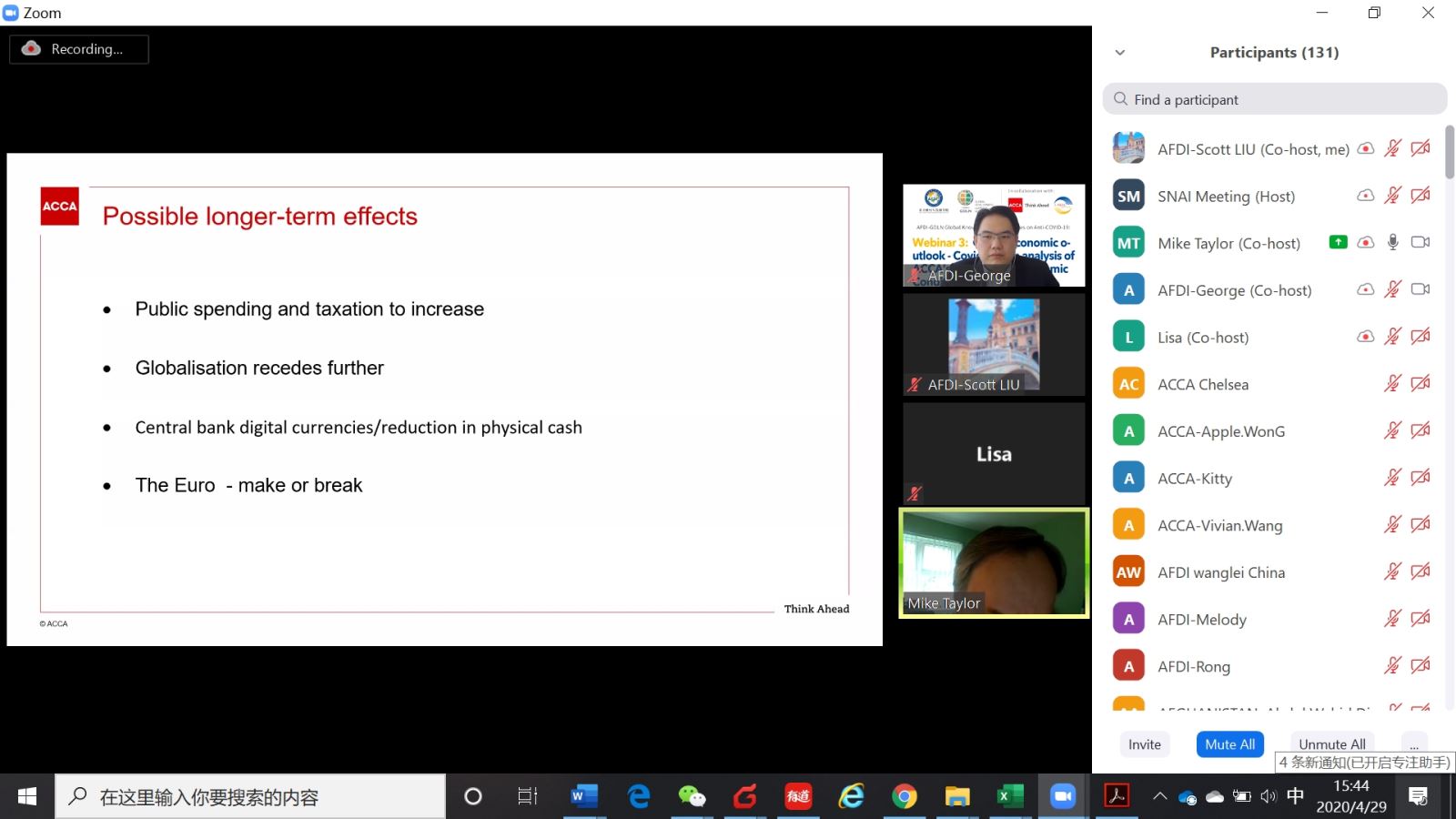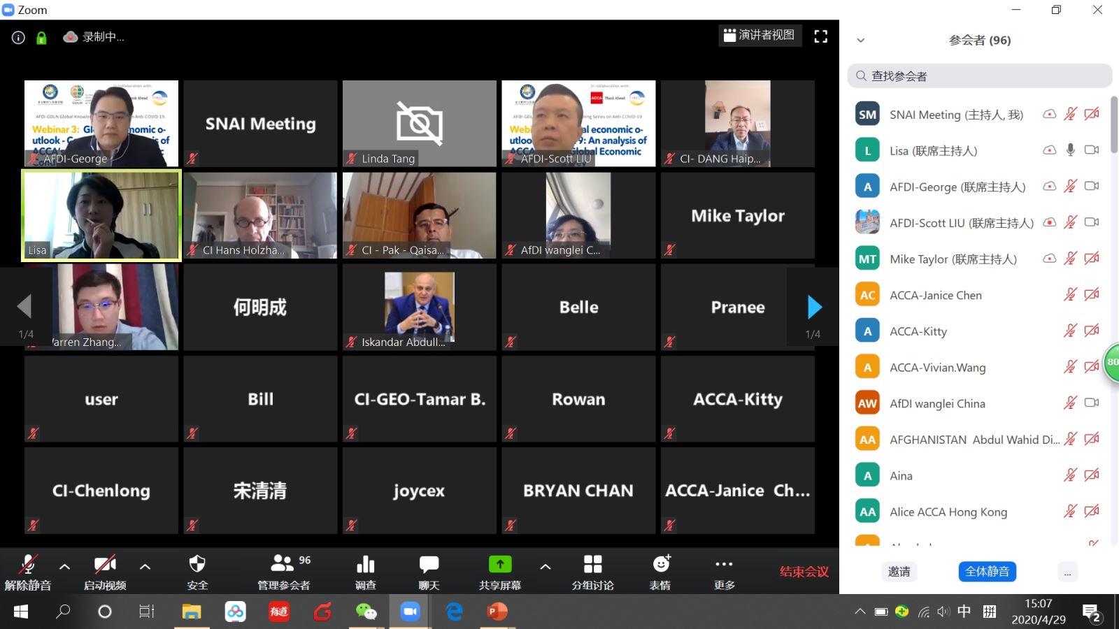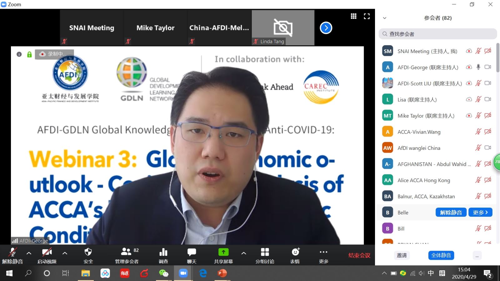 4月29日下午,由上海国家会计学院(亚太财经与发展学院)与ACCA、中亚学院以及全球发展学习网络(GDLN)联合举办的全球抗疫在线知识分享活动第三期研讨顺利举行。此次研讨主题为“新冠肺炎疫情对全球经济的影响——基于ACCA最新全球经济状况调研报告的分析”,来自中国、英国、阿富汗、老挝、柬埔寨、韩国、泰国、哈萨克斯坦、吉尔吉斯斯坦、乌兹别克斯坦等10多个国家及地区的130多名代表全程参加了本次研讨。研讨由学院国际培训部刘曜榘博士主持,ACCA华中区首席代表朱晓芸女士致开幕词。