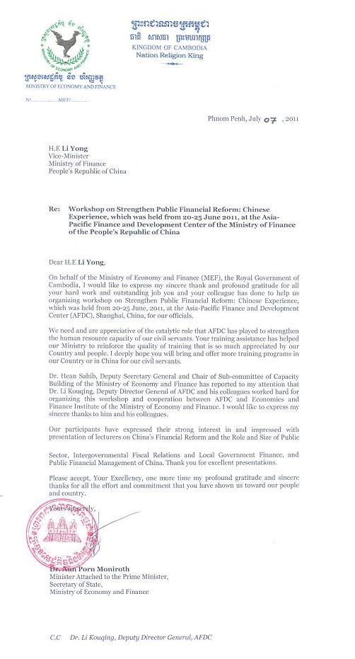 Thanks Letter from the Ministry of Economy and Finance, the Royal Government of Cambodia