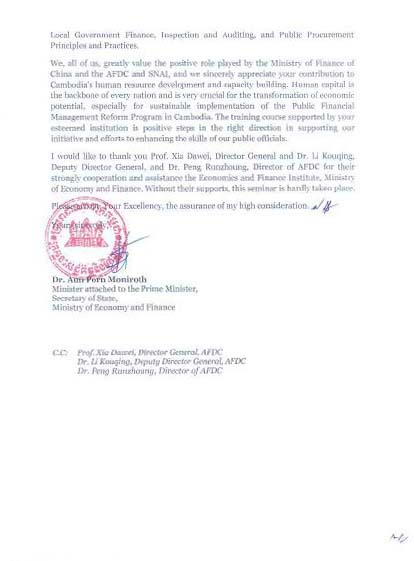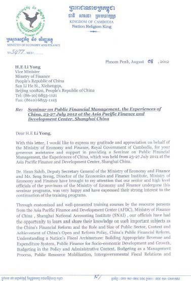 Thanks Letter from the Ministry of Economy and Finance, the Royal Government of Cambodia