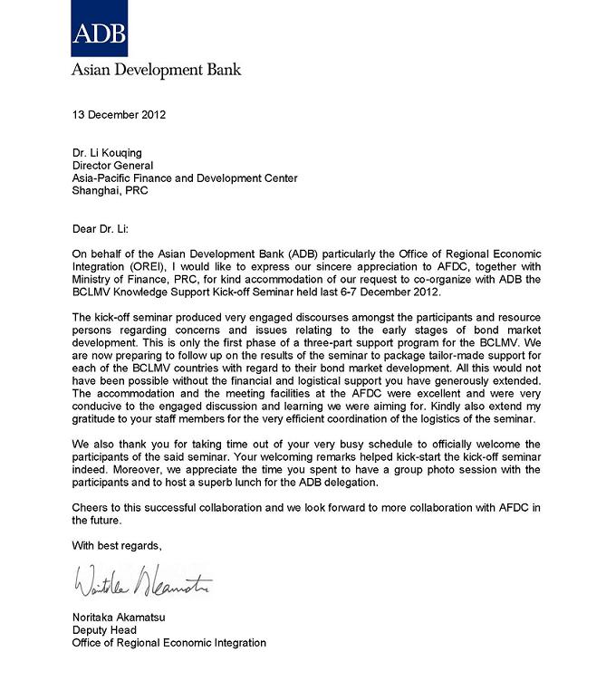 Thanks letter from ADB