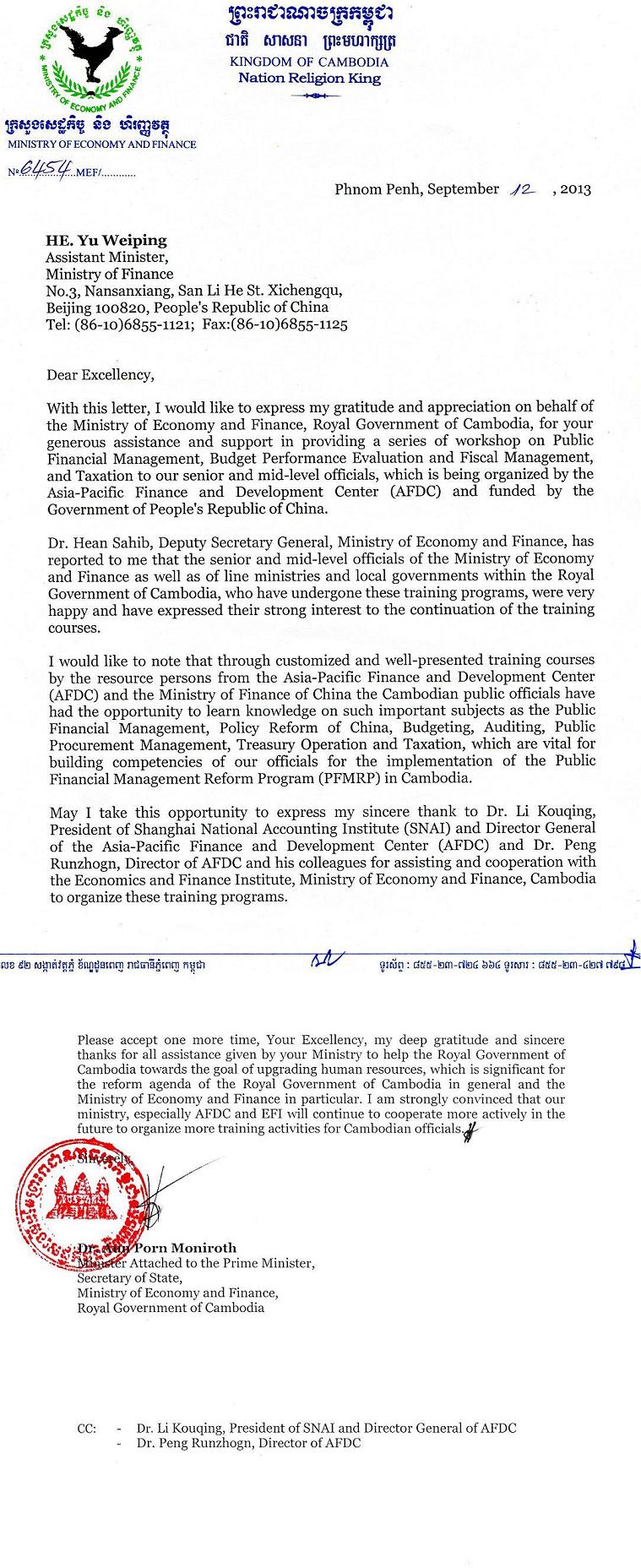 Thanks letter from Ministry of Economy and Finance, Royal Government of Cambodia