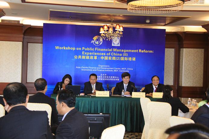 The 2nd Workshop of China-Cambodia Capacity Building Program 2014 on Public Financial Management Reform: Experience of China, which was co-organized by the Asia-Pacific Finance and Development Center (AFDC), Ministry of Finance of China and Economics and Finance Institute (EFI), Ministry of Economy and Finance of Cambodia was held on June 9-13 in Shanghai, China. Dr. Hean Sahib, Secretary of State of Ministry of Economy and Finance of Cambodia and Dr. LI Kouqing, General Director of AFDC jointly opened the training and delivered welcome remarks on behalf of the training co-organizers.